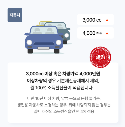 자동차의 경우 3.000cc 이상 또는 4,000 만원 이상 고급 자동차 및 회원권을 보유하고 있으면 기본 재산공제 대상에서 제외되고, 월 100% 소득 환산율이 적용됩니다.