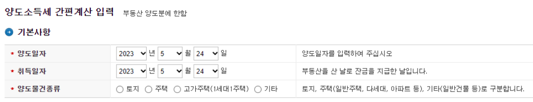 위의 양도세 자동계산 바로가기를 클릭하면 홈택스 양도세 계산기로 이동하니다.