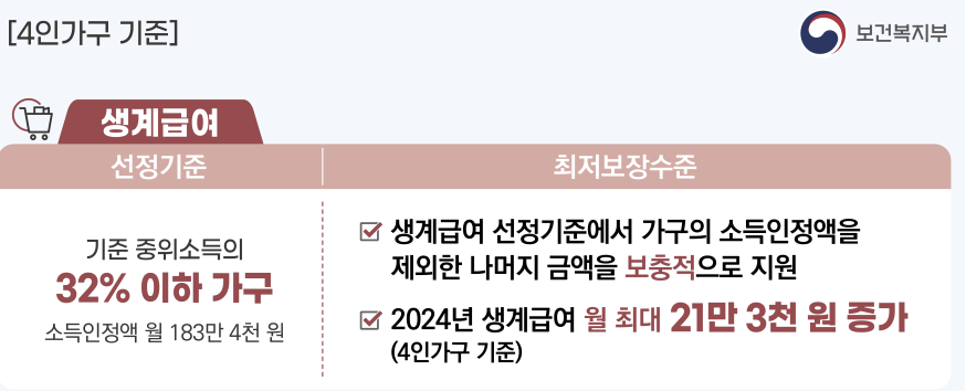 2024년 주거급여 수급자격 소득인정액 중위소득 48%는 1인 가구 106만 9,654원, 2인가구 176만 7,652만 원, 3인 가구 226만 3,035만 , 4인 가구 275만 358만 원입니다.
