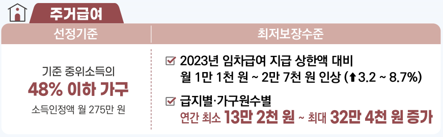 주거급여 수급자격 재산기준 중위소득이 2023년 대비 올라가면서 지원 대상이 늘어나 더 많은 분들이 혜택을 받으실 것 같습니다.