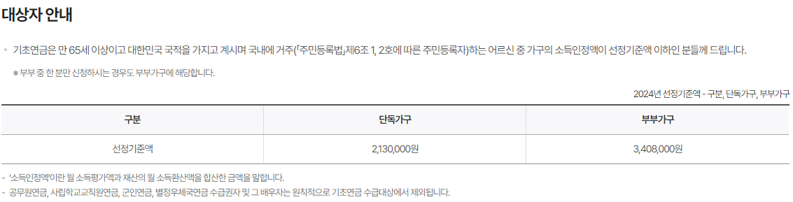 노령연금 수급자격으로는 만 65세 이상 어르신중 소득인정액이 선정기준액 이하인 분들이 대상입니다. 2024년 선정기준액은 단독가구는 월 213만원, 부부 가구는 340만원 입니다.
