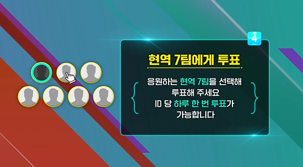 응원하는 참가자가 있다면 잊지 말고 하루 한번 매일 투표하세요. 1~2분만 시간을 내시면, 매일 나의 현역 가수에게 투표할 수 있습니다.