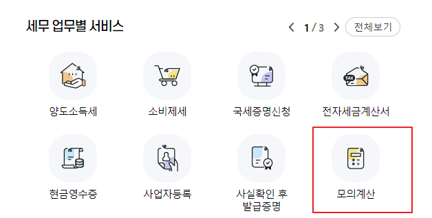연말정산 환급금 조회를 하기 위해서는 국세청 홈택스 홈페이지에서 조회할 수 있는데요. 홈택스 홈 화면에서 세금모의계산 메뉴를 선택하고 연말정산 자동계산 메뉴를 클릭합니다.
