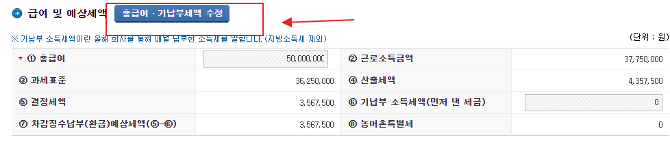 조회하고 싶은 귀속 연도를 선택하고 연말정산 자동계산 화면에서 '총 급여', ' 기납부세액 수정' 버튼을 클릭하고 총 급여와 기납부액을 입력합니다.