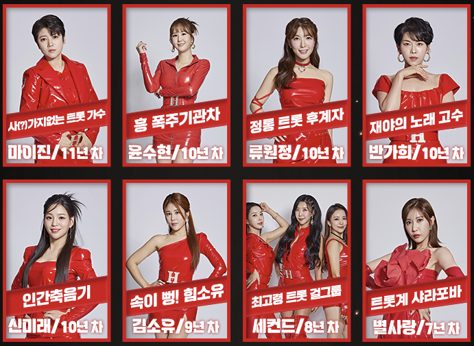 지금까지 현역가왕 탈락자를 다시 한번 정리하면 윤태화, 한봄, 유민지, 주미, 강소리, 반가희, 신미래, 김소유, 세컨드, 요요미, 박성연, 김나희, 김지현, 정혜리, 송민경, 하이량, 마스크걸입니다.