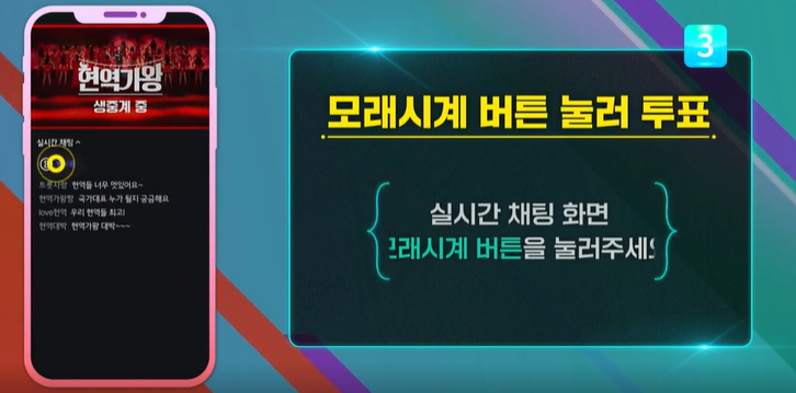 현역가왕 투표하기는 나우앱을 통해서 투표할 수 있습니다. 나우앱에서 현역가왕을 검색한 후 라이브 화면에서 모래시계 버튼을 눌러줍니다.