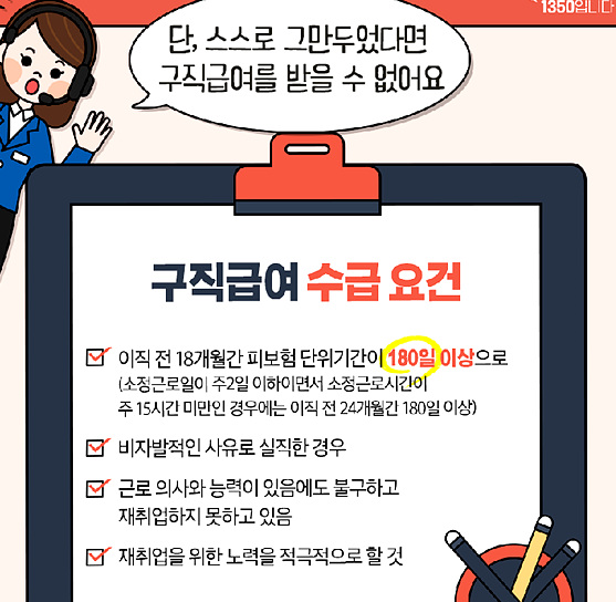 즉, 실업급여 조건 6개월 180일은 아르바이트 또는 회사에서 근무한 기간이 6개월 이상 근무하고 고용보험 가입기간이 180일 이상이어야 실업급여 수급자격이 됩니다.
