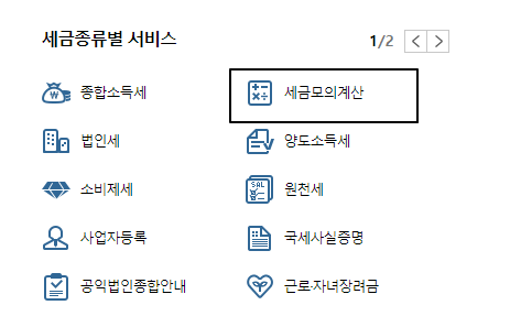 국세청 홈택스 메인 화면에서 '모의계산' 메뉴를 선택합니다. 모의계산 메뉴에서 '퇴직소득 세액' 계산기를 선택합니다.