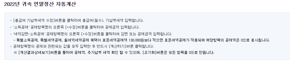 메뉴를 선택하면 귀속 연도를 선택하는 창이 나옵니다. 조회하고 싶은 귀속 연도를 선택하시기 바랍니다. 이후 연말정산 자동계산 화면에서 '총 급여, 기납부세액 수정' 버튼을 클릭하고 총 급여와 기납부세액을 입력합니다.