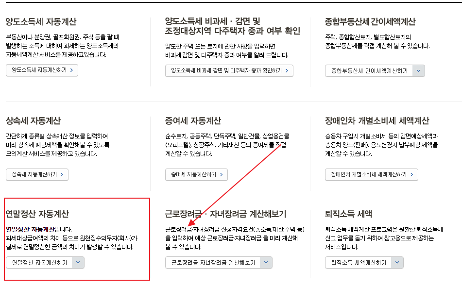 '세금 모의계산' 메뉴에서는 양도소득세, 종부세, 증여세 등등 다양한 세금들을 계산해 볼 수 있습니다. 우리는 연말정산 환급금 조회를 해야 하기 때문에 '연말정산 자동계산' 메뉴를 선택합니다.