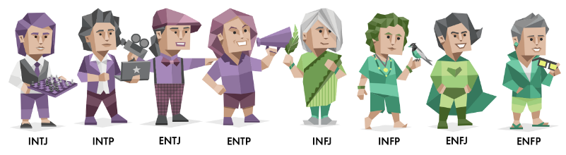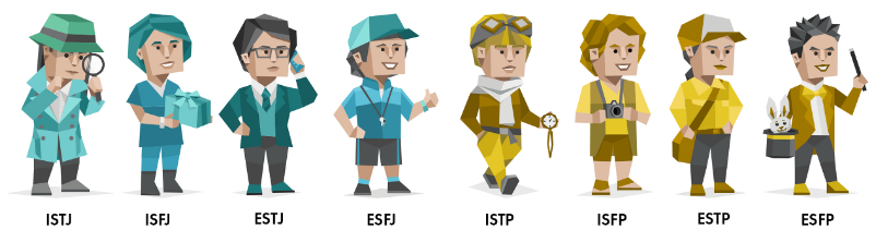 에너지의 방향에 따라 외향 E과 내향 I, 인식의 기능을 나타내는 감각 S과 직관, 판단하고 결정을 내리는 사고 T와 감정 F, 생활양식을 보여주는 판단 J와 인식 P, 이렇게 총 4가지 지표에 따라 총 16가지 유형을 구분합니다.