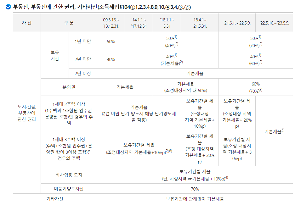 토지 양도소득세율은 사업용 토지 여부에 따라 차이가 있습니다. 2년 미만 토지를 보유했을 경유 세율은 동일하지만, 그 이상 기간 토지를 보유했을 경우에는 비사업용 토지는 사업용 토지보다 10% 더 높은 세율이 적용됩니다.
