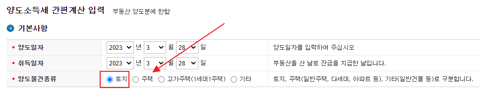 토지 양소도득세 계산을 위해서 양도소득세 계산화면에서 토지를 선택해서 계산하시면 됩니다.