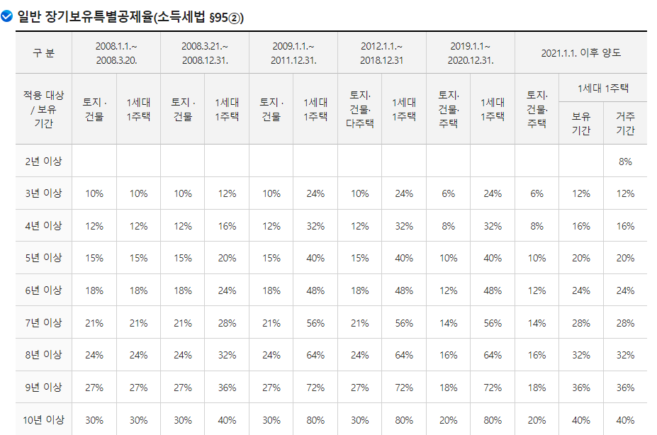 10년 이상 보유한 토지의 경우 20% 장기보유 특별공제를 적용받을 수 있는데 보유기간에 따라 최대 30% 까지 장기보유 특별공제를 받을 수 있습니다.