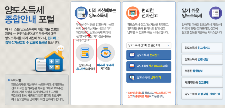 양도소득세는 일반 사람들은 쉽게 계산하기 어려운 복잡한 구조이기 때문에 전문적인 분들에게 의뢰하여 처리하는 경우가 많습니다. 하지만 국세청에서는 간단하게 양도소득세 자동계산 할 수