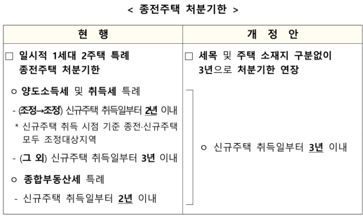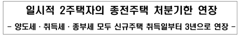 다만 정부에서는 일시적 2 주택자의 종전주택 처분기한을 연장했습니다. 1 가구 2 주택 양도소득세 면제를 받기 위해서 2 주택 취득일로부터 1년 내에 기존 주택을 처분 시 1 주택자와 동일한 세금을 적용받을 수 있었는데 주택 처분기한을 1년에서 2년으로 연장했으며 다시 기존주택 처분기한을 2년에서 3년으로 연장되었습니다.