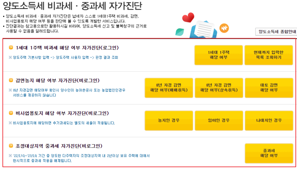 홈택스에서는 양도소득세 비과세 감면 대상여부와 다주택자 중과 대상인지 확인할 수 있도록 자가진단 서비스를 제공하고 있습니다.