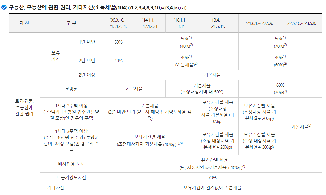 양도소득세 세율은 보유기간과 주택 수에 따라 양도소득세 세율이 달라지고 보유 주택이 1 가구 2 주택이라면 조정대상지역에 보유하고 있는지에 따라서도 양도소득세율이 달라지기 때문에 국세청 홈택스 양도소득세 비과세 대상 자가진단을 통해서 확인해 보시기 바랍니다.