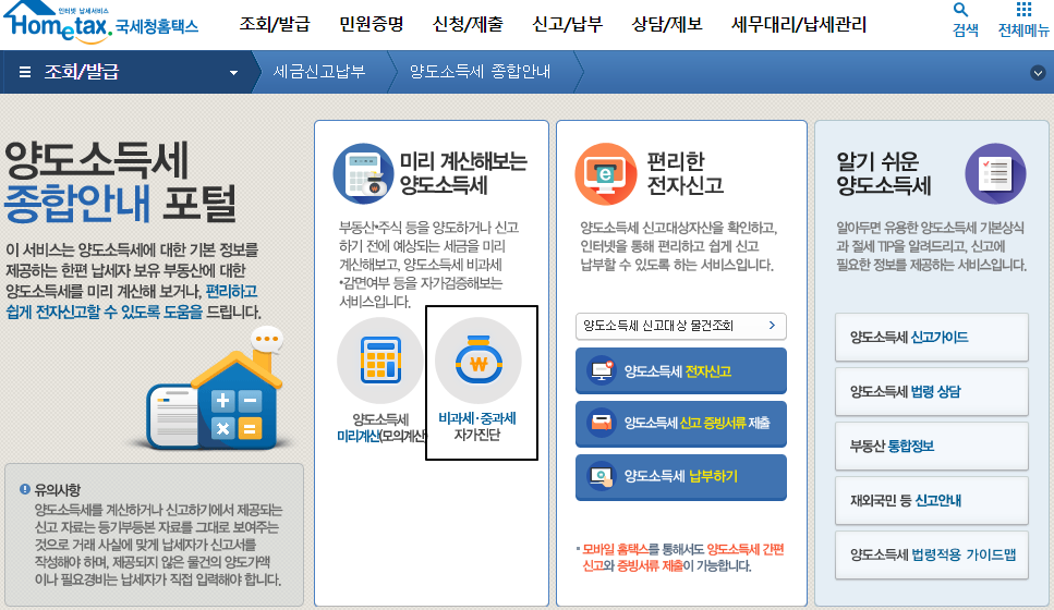 위의 바로가기를 선택하면 홈택스 홈페이지로 이동합니다. 1세대 1 주택 비과세 해당여부 및 조정대상지역 중과세 자가진단을 통해서 양도소득세 면제조건에 충족이 되는지 확인이 가능하니 자가진단 해보시기 바랍니다.