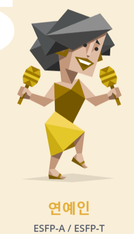 ESFP - 사교성이 뛰어나며 활동적인 유형으로 주변에서 일어나는 일에 관심이 많고 분위기 메이커의 역할을 수행합니다. 친근하고 활동적이며, 사람들을 즐겁게 하는 것을 좋아하는 연예인입니다.
