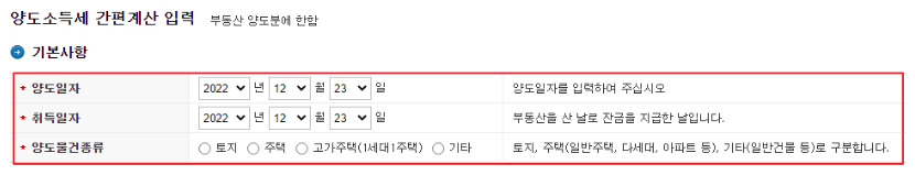 또한 비과세 요건 체크 항목에서 1세대 1 주택으로 2년 이상 보유했는지, 다주택자인지 등을 체크할 수 있습니다.