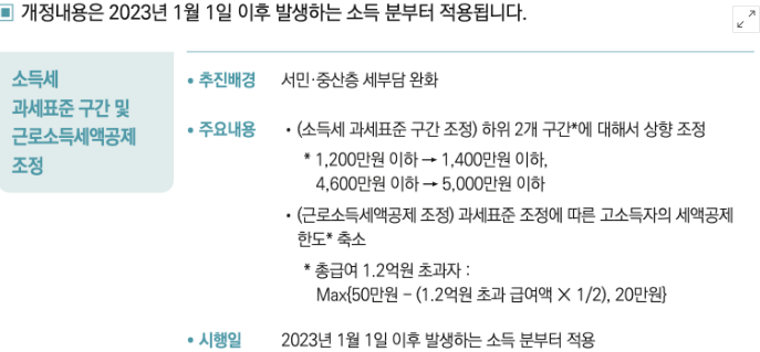 이러한 변경으로 인해 1200만 원에서 1400만 원 이하 소득 구간에서는 15%에서 6%로 세율이 낮아져 세금 부담이 줄어들게 됩니다.