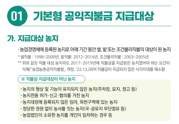 공익직불금 신청자격 농지는 쌀직불, 밭직불 또는 조건불리직불의 대상이 된 농지로 신청인이 직접 경작하고 농업경영체에 등록된 농지여야 합니다.
