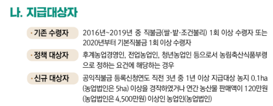 특히 올해부터는 그동안 공익직불금 지급 대상에 포함되지 않았던 2017년 ~ 2019년 중 1회 이상 종전 공익직불금을 지급받은 실적이 없는 농지도 신청할 수 있습니다.
