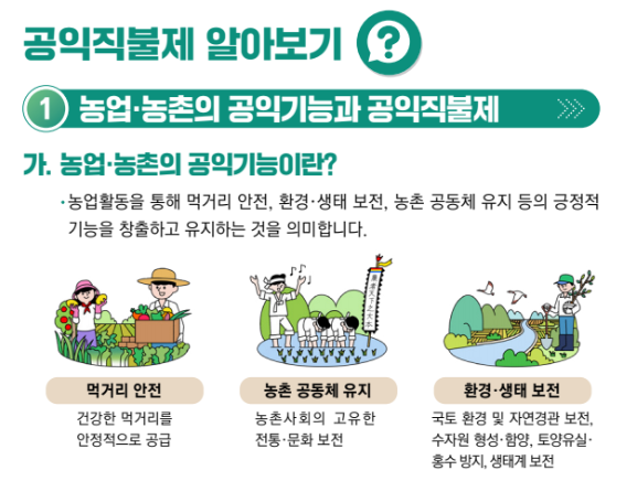 공익직불금이란 농업 활동을 통해 식품안전, 환경보전, 농촌 유지 등 공익을 창출하도록 농업인에게 보조금을 지원하는 제도입니다. 지난 2020년 4월, 기존 6개의 영역을 개편해 선택형 공익직불금과 기본형 공익직불금으로 나누어 시행되고 있습니다.