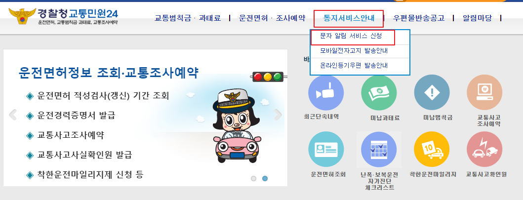 또한 이렇게 일일이 확인하는 게 번거롭다면 메인 화면에서 '통지 서비스 신청'을 선택한 후 문자 알림 서비스 신청을 하는 게 좋습니다.