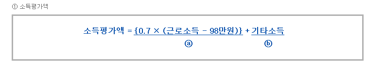 소득평가액 {0.7 X (근로소득 - 103만 원)} + 기타 소득으로 계산됩니다.