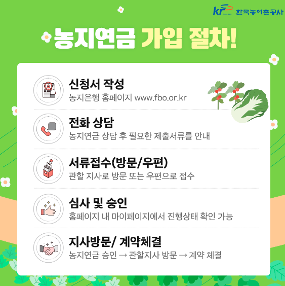농지연금을 신청하려면 농지은행 사이트에서 접수 신청 후 공사 직원의 연락을 받고 가입을 진행하면 됩니다.