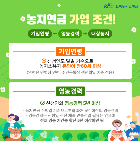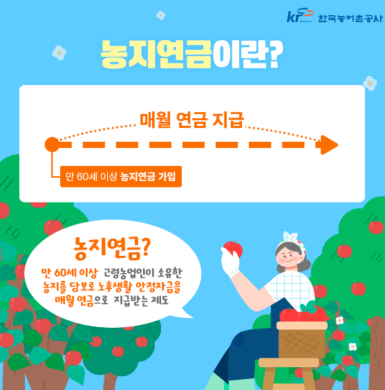 농지연금이란 만 60세 이상 고령농업인이 소유한 농지를 담보로 노후생활을 안정적으로 보내실 수 있게 매월 연금으로 지급받는 제도입니다.