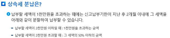 상속세 납부방법은 일시에 납부하는 것이 원칙이나 일시납부에 따른 과도한 세부담을 분산시켜 납세의무의 이행을 쉽게 하기 위하여 일정요건이 성립되는 경우에는 분할하여 납부할 수 있습니다.