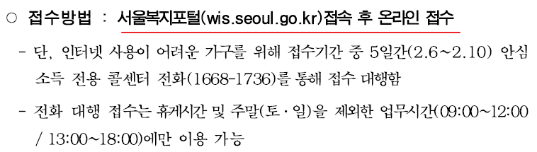 신청을 원하는 가구는 1월 25일부터 ~ 2월 10일까지 17일간 서울복지포털을 통해 온라인으로 신청할 수 있습니다.