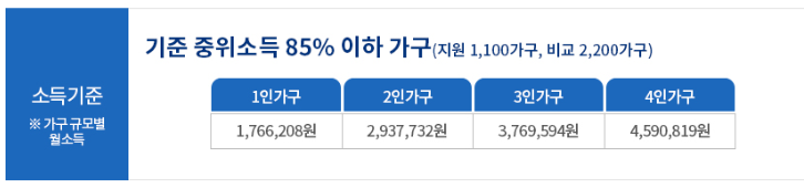 2023년 기준 중위소득 85%는 1인 가구 월소득 약 177만 원, 2인 가구 294만 원, 3인 가구 377만 원 등입니다.