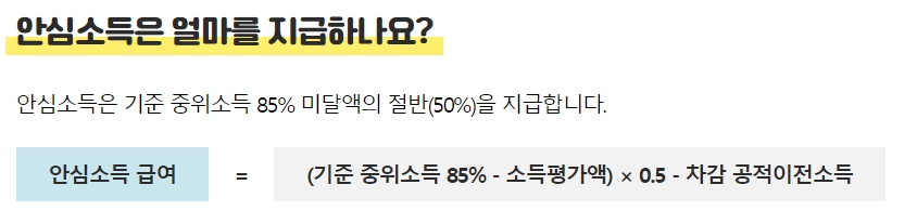 (기준중위소득 85% - 소득평가액 ) ×0.5 - 차감 공적이전소득 = 안심소득 급여