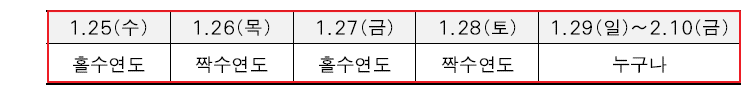 28일까지는 시스템 과부하 방지를 위해서 출생연도 끝자리 기준 홀짝제로 운영됩니다. 1월 29일부터는 누구든 가능합니다.