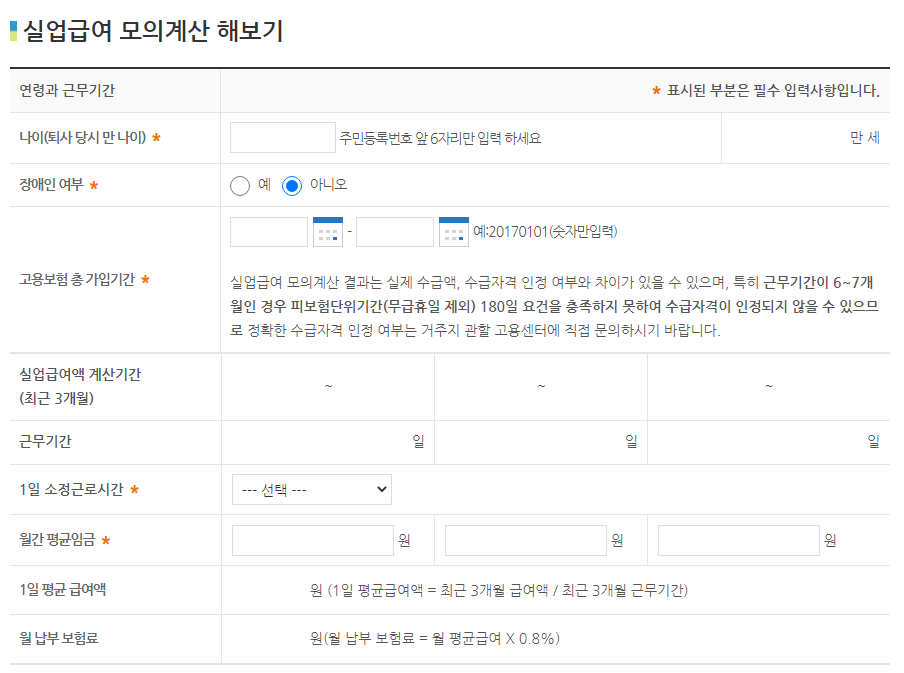 실업급여 모의계산 방법으로는 고용노동부 홈페이지에서 계산할 수 있습니다. 나이, 고용보험 가입기간, 1일 소정근로시간, 월간 평균임금을 입력하면 대략적인 실업급여 예상 지급액 계산이 가능합니다.