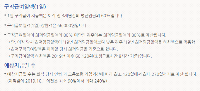 실업급여 금액 = 이직 전 평균임금의 60% × 소정급여일수 상한액은 2019년 1월 이후는 66,000원, 하한액은 60,120원입니다.