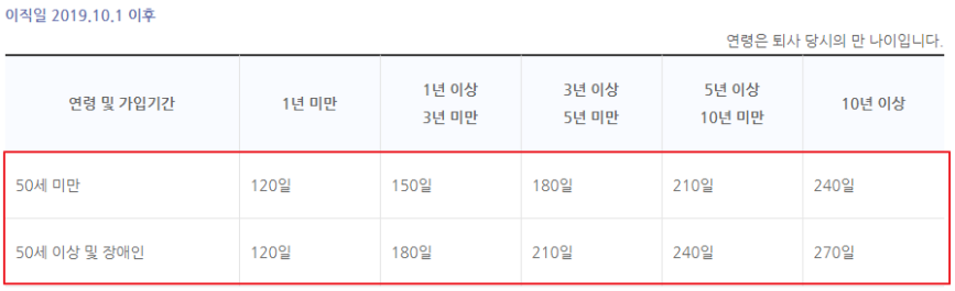 50세 미만이면서 3년 이상이면 180일, 5년 이상이면 210일, 10년 이상이면 240일이 실업급여 수급기간이 됩니다.
