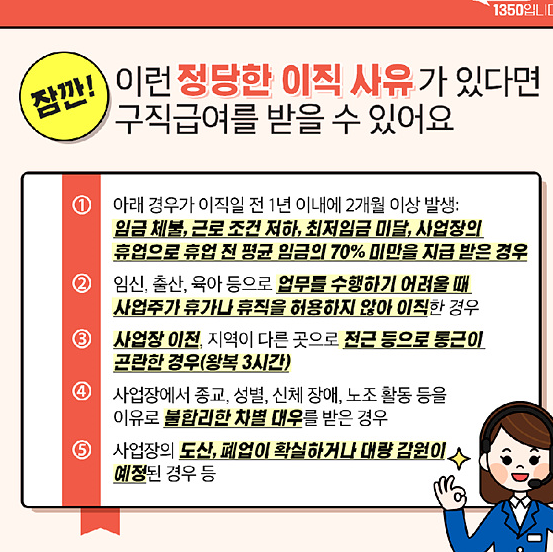 다만 정당한 이직 사유가 있다면 자진퇴사를 하는 경우에도 실업급여 수급자격이 됩니다. 예를 들어 사업장의 이전이나 지역을 달리하는 사업장으로 전근으로 인한 통근이 어려운 경우, 임금체불이 있는 경우 등이 해당됩니다.