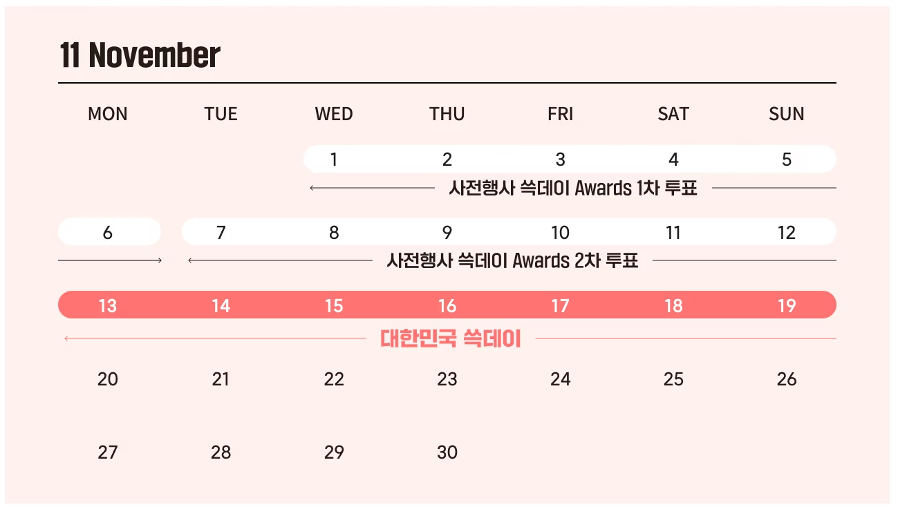 쓱데이 기간은 11월 13일부터 11월 19일까지 일주일간 진행됩니다. 오프라인 매장 행사는 17일부터 19까지 진행되며, G마켓 옥션은 11월 6일부터 빅스마일데이 행상의 마지막 일주일을 쓱데이로 대미로 장식할 예정입니다.