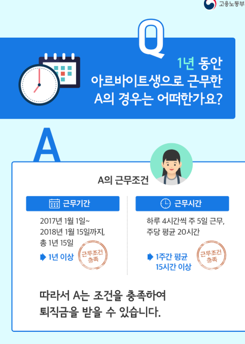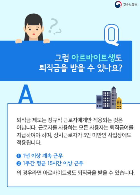 또한 정규직, 비정규직, 임시직, 알바, 계약직, 편의점 등등 근무형태나 종업원 수도 아무런 상관이 없기 때문에 아르바이트 퇴직금 지급기준에 해당이 되면 누구나 퇴직금을 받을 수 있습니다.