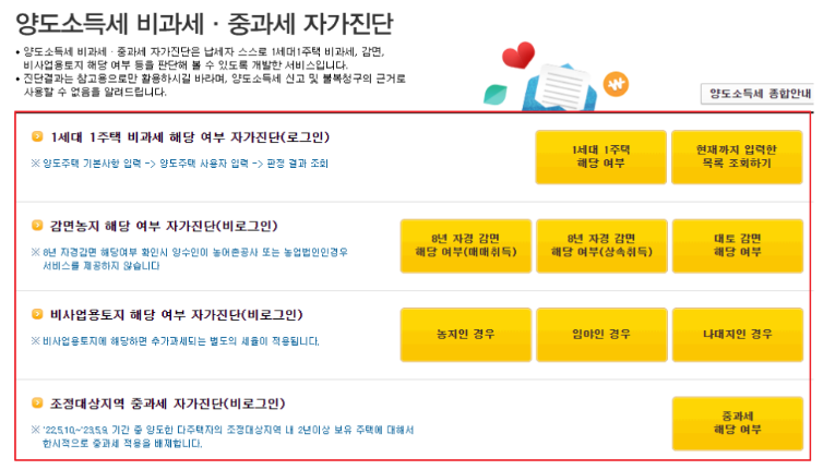 양도세 비과세 중과세 자가진단을 통해서 스스로 비과세 감면 대상인지 판단해 볼 수 있으니 이용해 보시기 바랍니다.