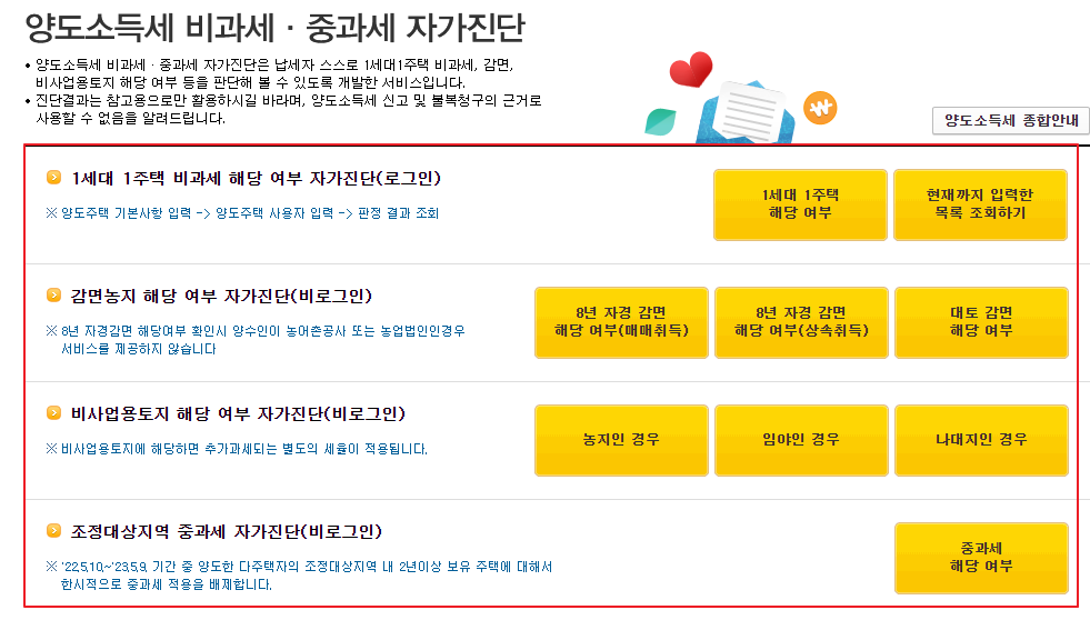 만약 양도소득세 비과세 대상인지, 중과세 대상인지 모르겠다면 자가진단을 통해서 확인해 보시기 바랍니다.