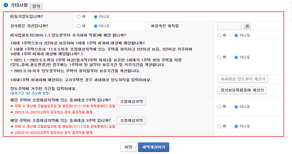 마지막 기타사항에서 세율 절감 효과가 큰 장기보유특별공제와 조정대상지역 여부를 입력하는 것입니다.