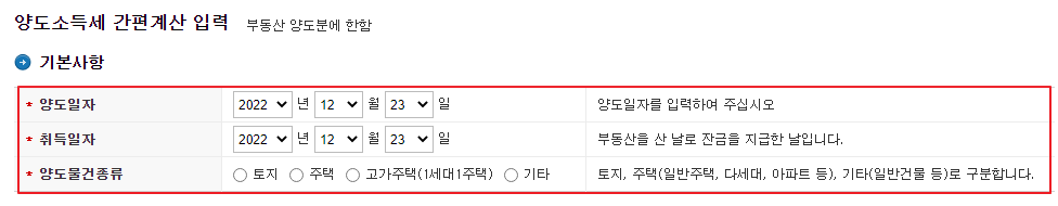 기본사항은 양도일자, 취득일자, 양도물건의 종류가 있으며, 거래금액에는 양도가액, 취득가액, 기타 필요경비, 양도소득기본공제 등을 입력하면 됩니다.