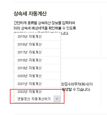 메뉴를 선택하면 귀속 연도를 선택하는 창이 나옵니다. 조회하고 싶은 귀속 연도를 선택하시기 바랍니다. 이후 연말정산 자동계산 화면에서 '총 급여, 기납부세액 수정' 버튼을 클릭하고 총 급여와 기납부세액을 입력합니다.
