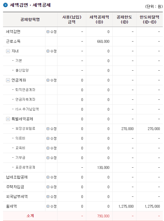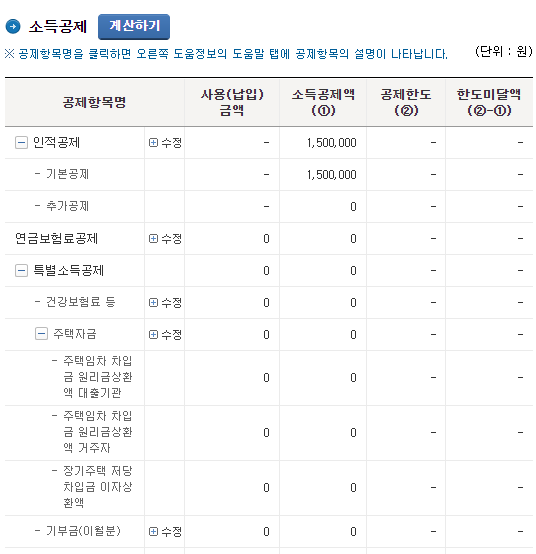 소득공제 메뉴에서는 인적공제, 신용카드 등등 해당하는 공제 항목을 작성합니다. 세액공제 메뉴에서도 각종 세액공제 항목들을 입력합니다.